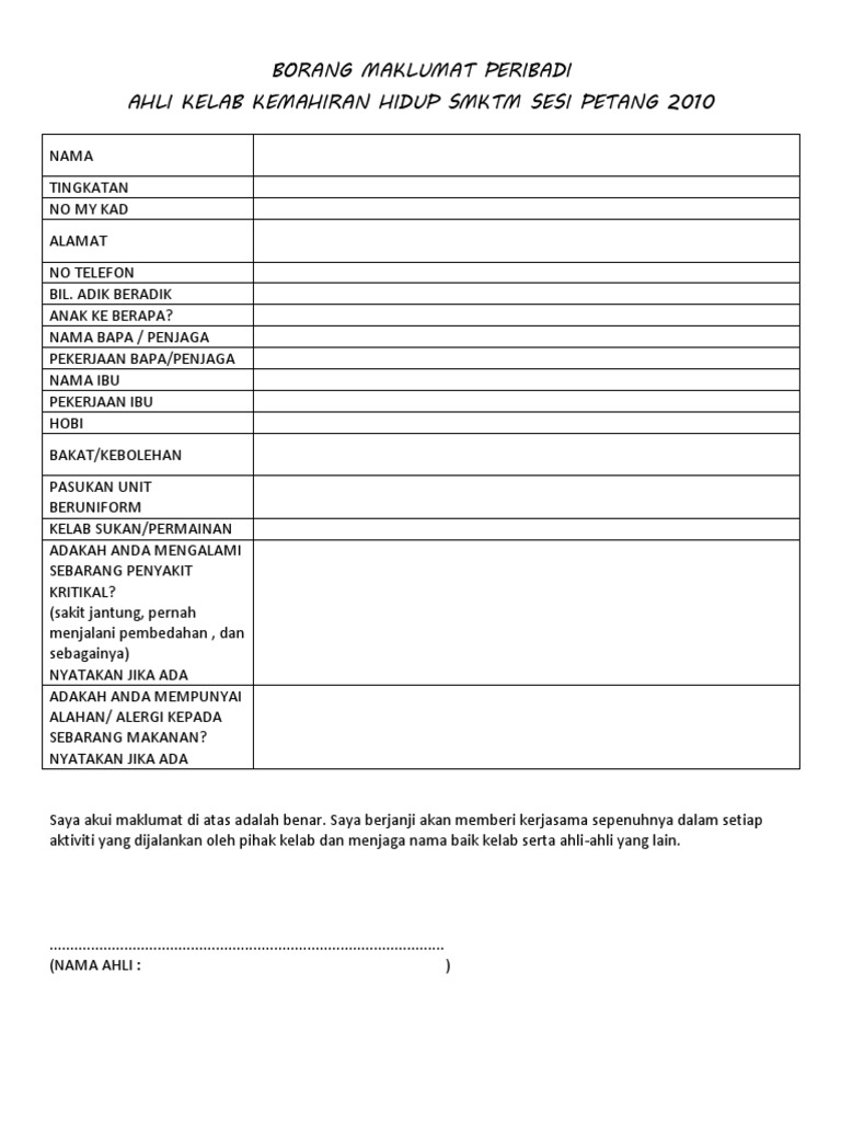 Borang Maklumat Diri from imgv2-2-f.scribdassets.com Namun dalam mengundurkan diri tentu saja ada prosesnya, dalam hal ini dengan cara menggunakan surat resign. Jadikan contoh borang yang diberi sebagai panduan untuk mengisi borang. D.o.b & age marital status gender religions race nationality current job language spoken language written availability education. 2) email semula kepada kami bersama dokumen yang diperlukan. Maklumat diri bapa / penjaga utama 20. Hubungan suami isteri , anak , ibu dan bapa kandung. Akta tabung haji 1995 (akta 535) th tertakluk kepada akta pencegahan pengubahan wang haram, pencegahan pembiayaan keganasan. Contoh borang soal selidik yang disertakan oleh mysumber ini adalah lebih menjurus kepada umum dan boleh dijawab dengan mudah oleh responden.