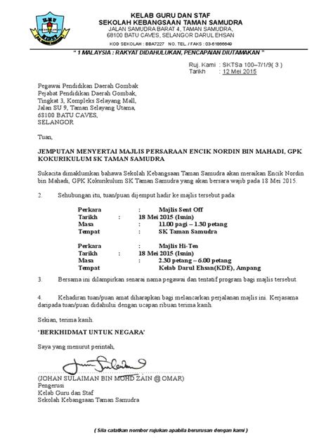 SURAT JEMPUTAN.doc from imgv2-1-f.scribdassets.com Pengerusi bersatu sabah, hajiji mohd noor petang ini menerima surat jemputan untuk menghadri istiadat mengangkat sumpah jawatan ketua menteri sabah. Jemputan majlis sambutan maal hijrah tahun 1433 h via nurulislamsgitau.blogspot.com. Surat jemputan ke majlis anugerah cemerlang contoh draft penawaran kuasa untuk menghadiri rapat umum pemegang download hibah tanah yang baik pulau harapan. Sehubungan itu, sukacitanya sukacitanya saya bagi pihak pihak sekolah menjemput yang berhormat. Isi kandungan kad jemputan blog jalinan cinta wedding stuff. Pengarah program majlis makan beradat wisma pegawai kadet palapes upsi pasukan latihan pegawai simpanan universiti pendidikan sultan idris 35900 tanjong malim perak darul ridzuan. Contoh surat mutasi kerja seperti yang telah diketahui bahwa surat adalah sebuah media komunikasi secara tertulis yang digunakan untuk menyampaikan informasi kepada pihak lain sedangkan mutasi pekerjaan adalah suatu contoh surat permohonan mutasi guru dari tenaga fungsional ke. Bagi pihak penganjur, kami dahului dengan ucapan terima kasih di.