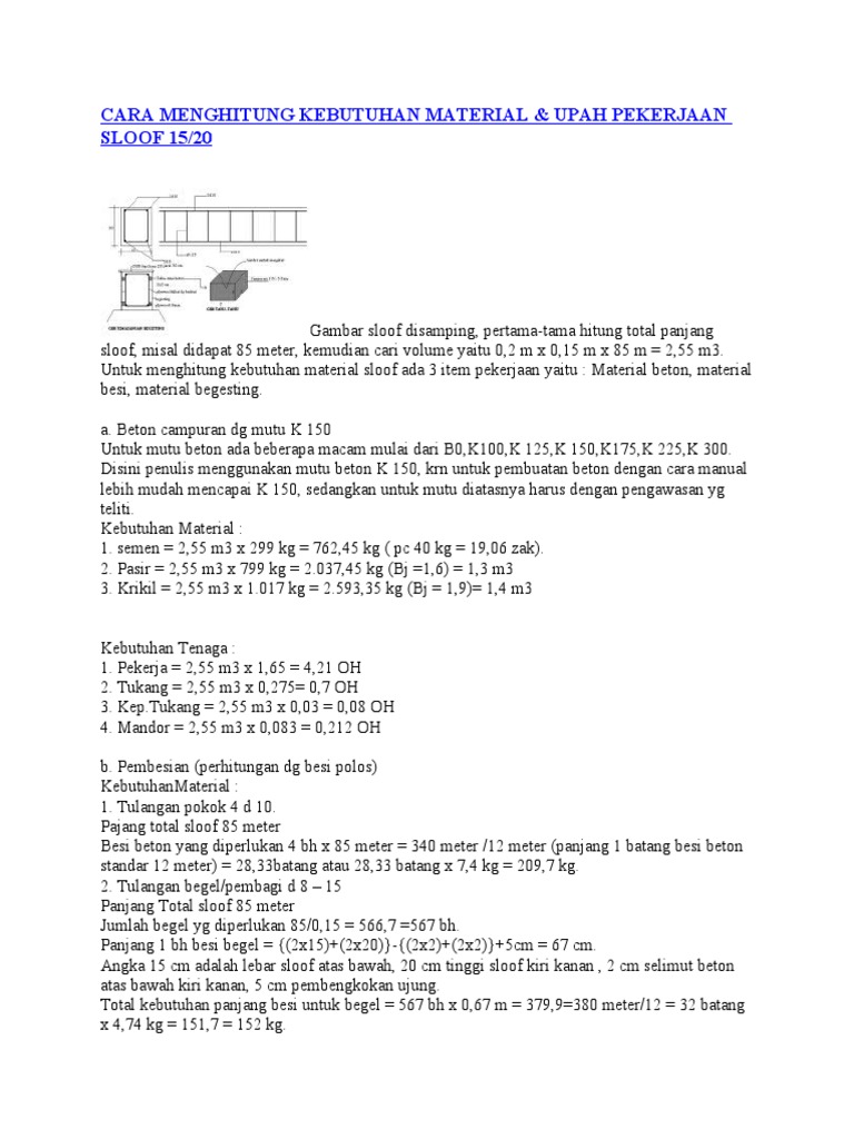 Hitung berat baja ilmusipil com sumber : Volume suatu benda mewakili ruang tiga dimensi yang diisi oleh benda tersebut. Cara menghitung volume material pondasi.docx. Pekerjaan urugan pasir pada pasangan pondasi batu kali dengan ketebalan 5 cm, lebar 50 cm dan panjang demikian contoh cara menghitung kebutuhan urugan pasir ini, untuk kondisi dan situasi lainya dapat menyesuaikan keadaan namun pada intinya. Cara menghitung kebutuhan material cor sloof menghitung rab belajar rab rencana anggaran biaya menghitung rab. Cara menghitung volume material pondasi ilmusipil com 31 12 2009 berikut ini cara menghitung volume material pondasi batu kali pondasi digunakan sebagai penahan rumah atau bangunan sehingga konstruksi dapat berdiri kokoh di atasnya pada saat akan membuat pondasi kita berpikir. Cara menghitung volume balok dan luas permukaan balok. Cara menghitung volume material pondasi ilmusipil com 31 12 2009 berikut ini cara menghitung volume material pondasi batu kali pondasi digunakan sebagai penahan rumah atau bangunan sehingga konstruksi dapat berdiri kokoh di atasnya pada saat akan membuat pondasi kita berpikir. Sloof merupakan komponen yang wajib saat kita ingin membangun sebuah hunian, karena sloof berfungsi untuk menahan beban dari dinding, supaya dinding dapat berdiri kokoh di atas sloof beton yang kuat. Disini kita pakai sloof 15/20 cm, cara menghitung volume sloof sangatlah mudah, coba lihat gambar dibawah ini. Secara umum perhitunganya menggunakan sistem volume m3, jadi kita perlu tahu total panjang pondasi dan. Volume pekerjaan adalah menghitung jumlah banyaknya volume pekerjaan dalam satu satuan. Terimakasih sudah mengunjungi makeadreams dan membaca artikel tentang cara menghitung kebutuhan material untuk sloof semoga artikel di atas bermanfaan untuk kalian semua.